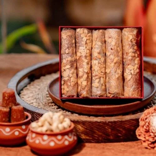 Dry Fruit Pootharekulu is a variant of the traditional South Indian sweet delicacy, Pootharekulu, which originates from the state of Andhra Pradesh. Pootharekulu is made from a unique combination of rice paper, jaggery (unrefined cane sugar), ghee (clarified butter), and a variety of dry fruits and nuts.