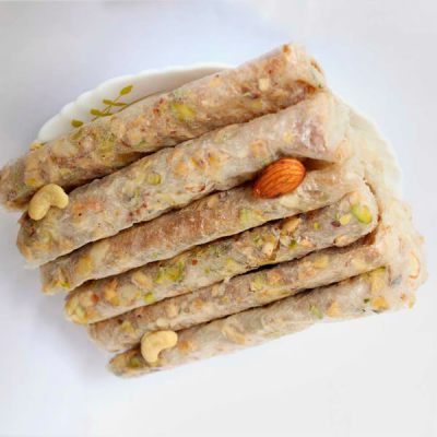 Dry Fruit Pootharekulu is a variant of the traditional South Indian sweet delicacy, Pootharekulu, which originates from the state of Andhra Pradesh. Pootharekulu is made from a unique combination of rice paper, jaggery (unrefined cane sugar), ghee (clarified butter), and a variety of dry fruits and nuts.